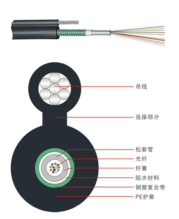 漢信 GYXTC8S光纜的結構是將 250μm 光纖套入高模量材料制成的松套管中,松套管內(nèi)填充防水化合物。松套管外用一層雙面涂塑鋼帶(PSP)縱包,鋼帶和松套管之間加阻水材料以保證光纜的緊湊和縱向阻水,和鋼絲絞線集成到一個8字型的聚乙烯護套內(nèi)。