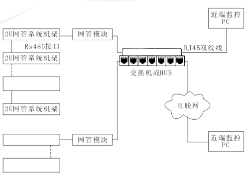 該結(jié)構(gòu)可通過通用RS485RS232轉(zhuǎn)換器,實(shí)現(xiàn)網(wǎng)管服務(wù)器對(duì)網(wǎng)絡(luò)的近程監(jiān)控。