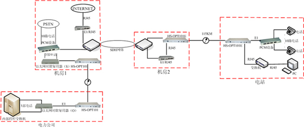 該方案采用我公司生產(chǎn)的PDH光端機(jī)、PCM設(shè)備、以太網(wǎng)時(shí)隙復(fù)用器,協(xié)議轉(zhuǎn)換器.實(shí)現(xiàn)了電力公司內(nèi)部電話和外部電話的延長,同時(shí)解決了以太網(wǎng)的接入和監(jiān)控?cái)?shù)據(jù)的傳輸!